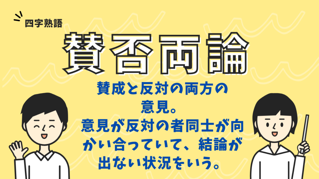 ニュースやSNSを見ていると、「この話題は賛否両論だね」なんて言葉をよく耳にしませんか?「賛否両論(さんぴりょうろん)」とは、物事に対して「賛成する人」と「反対する人」の両方がいて、意見が分かれている状態を表す四字熟語です。話題の映画や政治... -