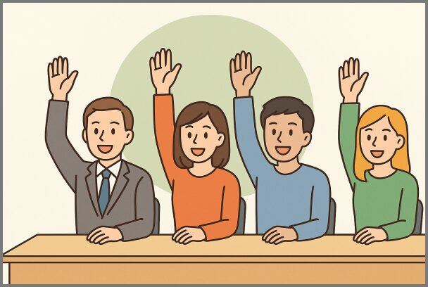 「満場一致(まんじょういっち)」は、会議や話し合いなどで、その場にいる全員が同じ意見に賛成したときに使います。たとえば、クラス全員が「修学旅行は京都に行きたい」と賛成した場合や、会社の会議で新しい計画に全員が同意した場合などです。誰一人反対せず、全員の気持ちがそろった場面を表す言葉です。