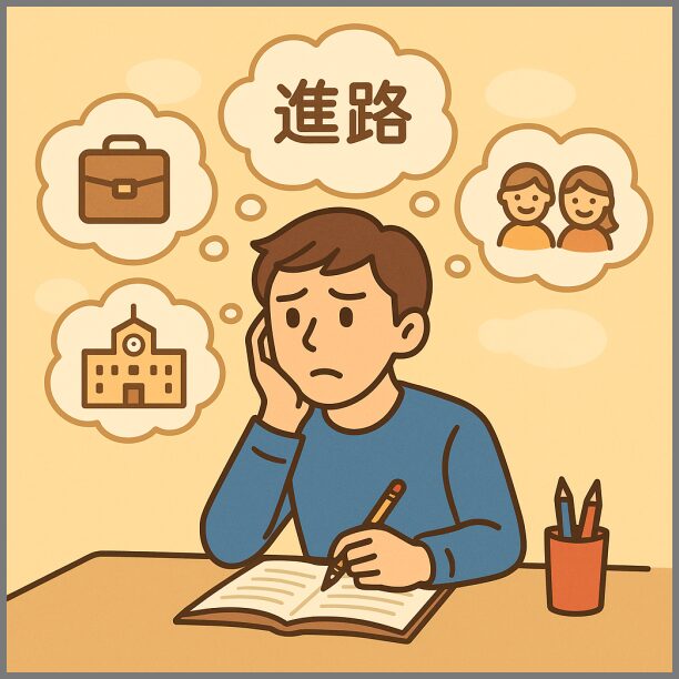 高校生が進学先を決めるとき、何度も考えを重ねて答えを出そうとしている場面です。